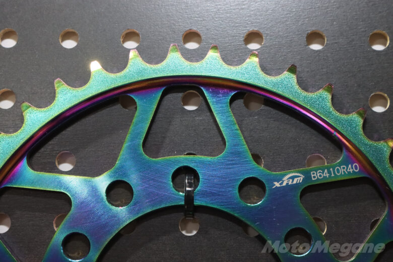 スプロケットの歯先に高周波焼入れを施した炭素鋼S45C材を素材に、大胆な肉抜きで軽量化を実現。さらにチタンの焼け色のようなレインボーの特殊メッキで耐摩耗性と美しいドレスアップ性を両立している。