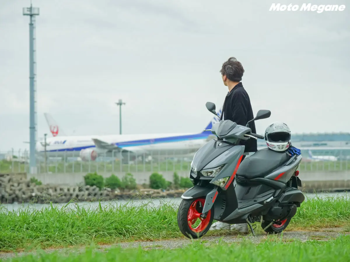 あいにくの曇り空でも気温は上がり、すっかり緩くなった空気を遠くから振動させているエアプレーン。大迫力の大型旅客機を目前に一息つける空港近くの公園は私のお気に入りのスポットだ。125ccのスクーターでは少し距離を感じるものの、大型バイクを出すほどの距離でもなく、ふと気が向いたらたまに来るくらいの場所だったのだが、そのくらいの距離でもシグナス グリファスと一緒ならお気に入りの格好で「ちょっとそこまで」来れてしまうから不思議だ。