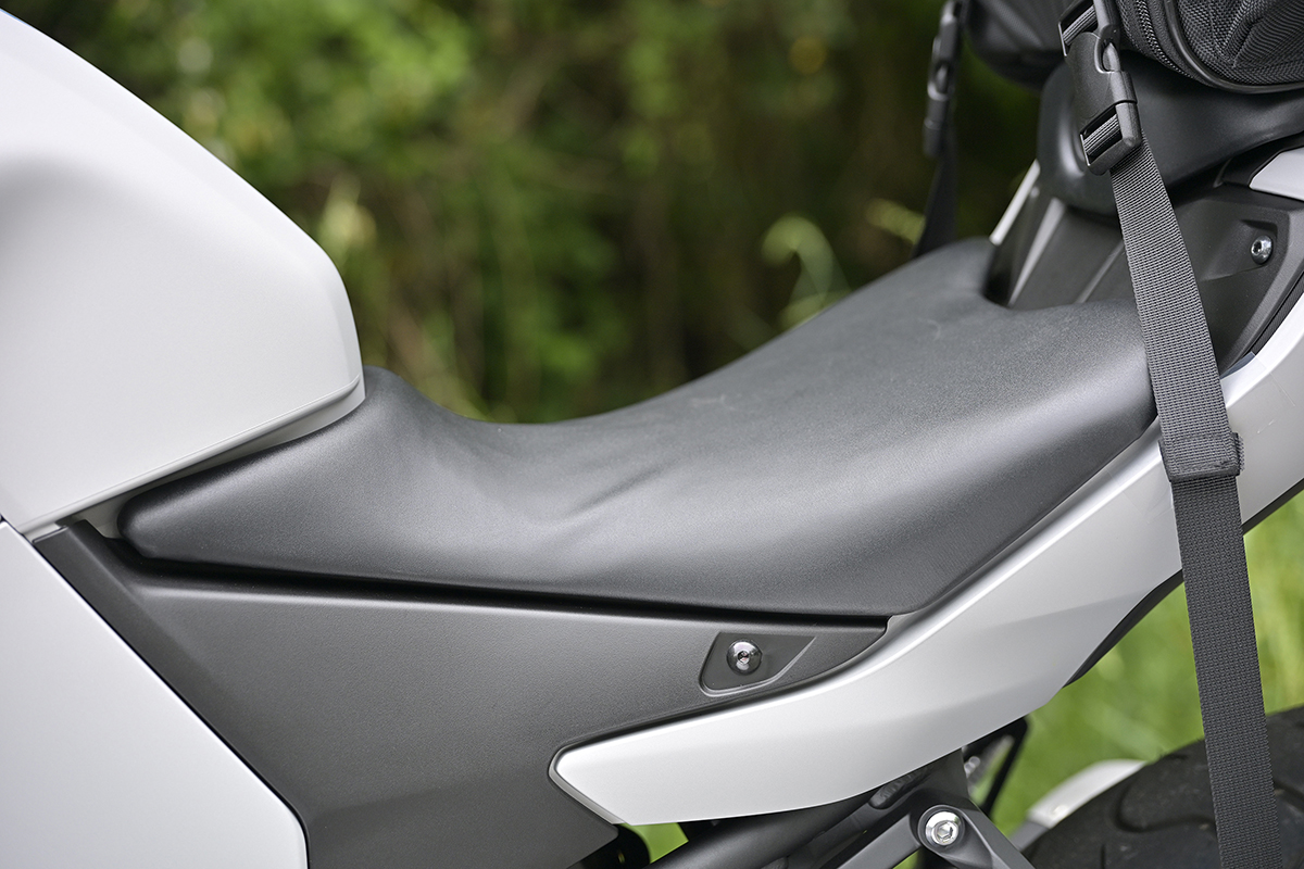それによって足つき性はかなり向上。身長165cmと小柄な上に足が短いボクでもほぼ両足が届く。160cm後半であれば確実にベタ付きになるだろう。
