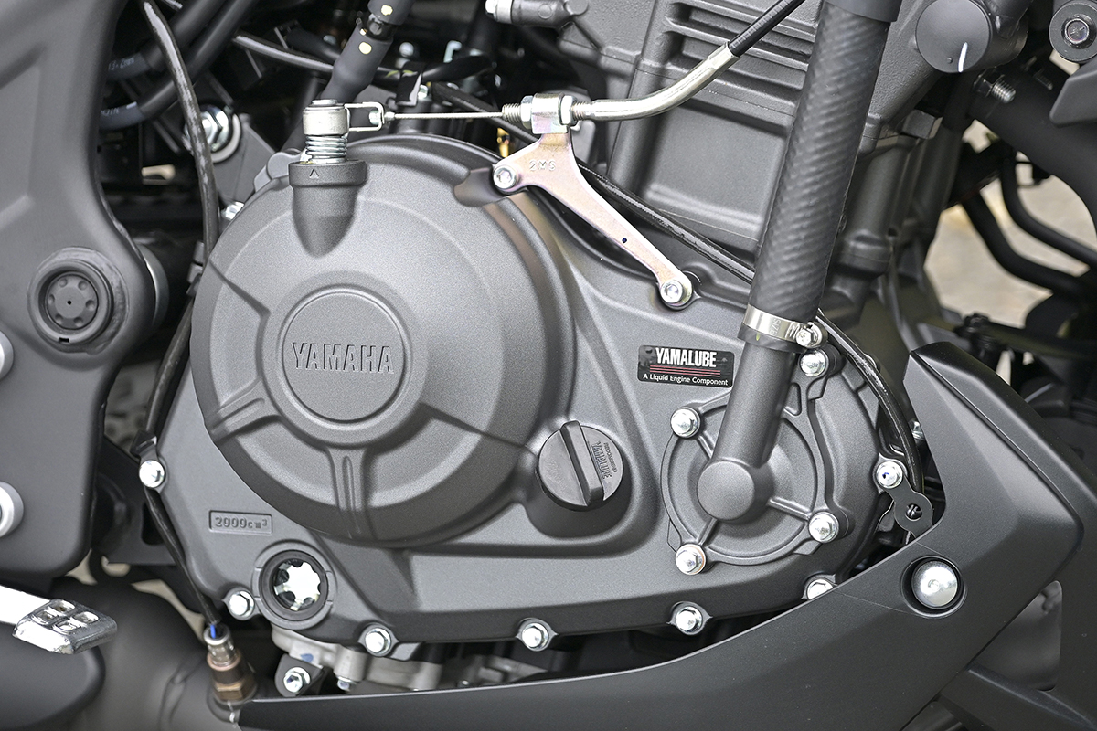 これは新たに採用されたアシスト&スリッパークラッチの効果。レバー操作を軽くすると同時に、急激なエンジンブレーキがかかったときにリヤタイヤがホッピングする(跳ねる)ことを抑制するシステム。