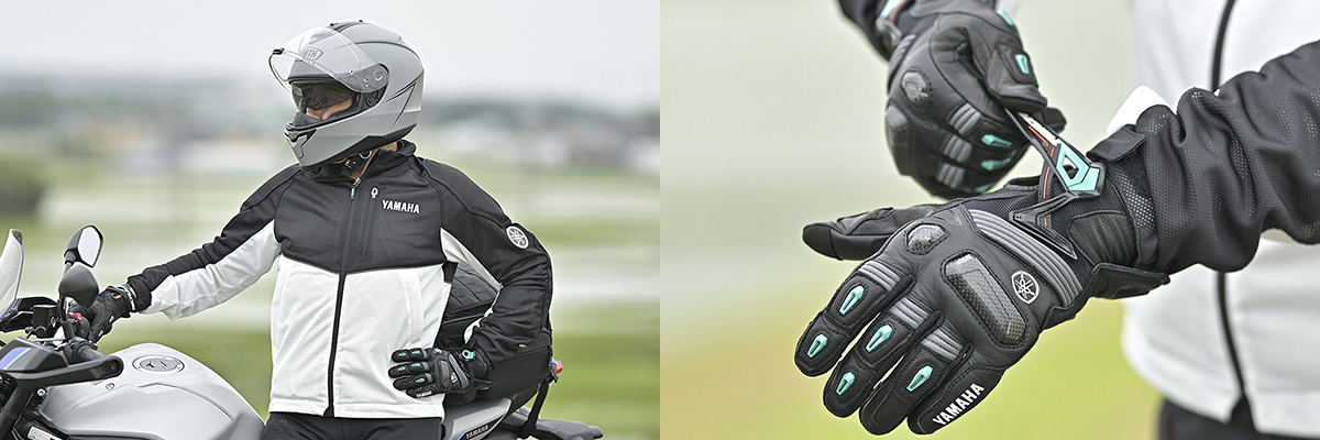 今回、試乗で使った快適なアイテムをご紹介。スモークのサンバイザーを内蔵したフルフェイスヘルメット(ワイズギア・YF-9 ZENITH ピンストライプ)はツーリングユースに最適。肩、肘、背中にソフトプロテクターを内蔵したジャケット(RY1002 メッシュジャケット)は、暑い季節のライディングを安全・快適にしてくれる。MTシリーズに似合うスポーティなデザインのグローブ(YL4003 スポーツレザーグローブ)は、スムーズな動きとプロテクション効果を両立。
