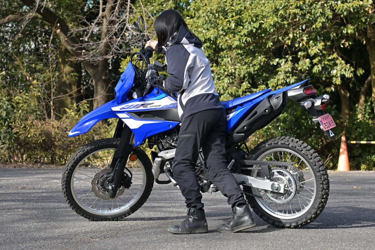 WR125Rの車重は138kg。その数値だけを見ると125ccとしては決して軽い部類ではない。しかし、ここでもバランスの良さがプラスに働いたようだ。「ネイキッドなどに比べるとハンドルの位置が高いんですが、押しにくいという印象はありません。重心も高めですが、オフ車としては一般的な感じです」
