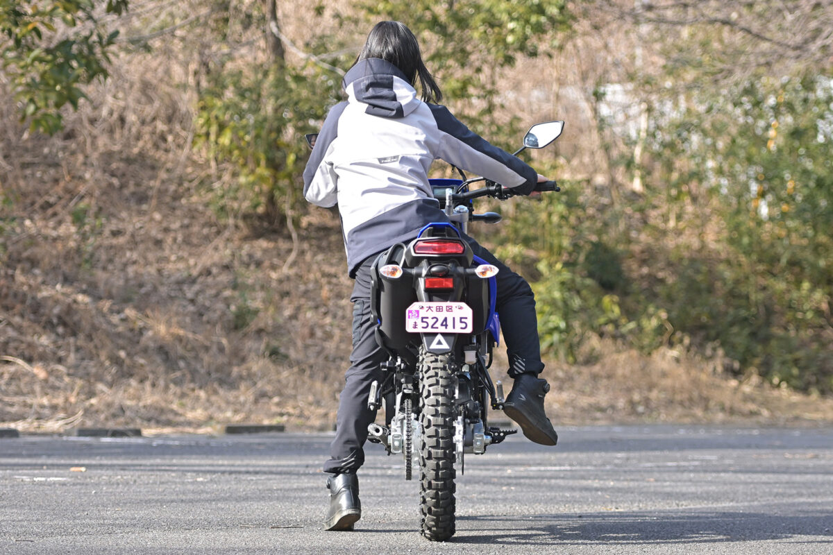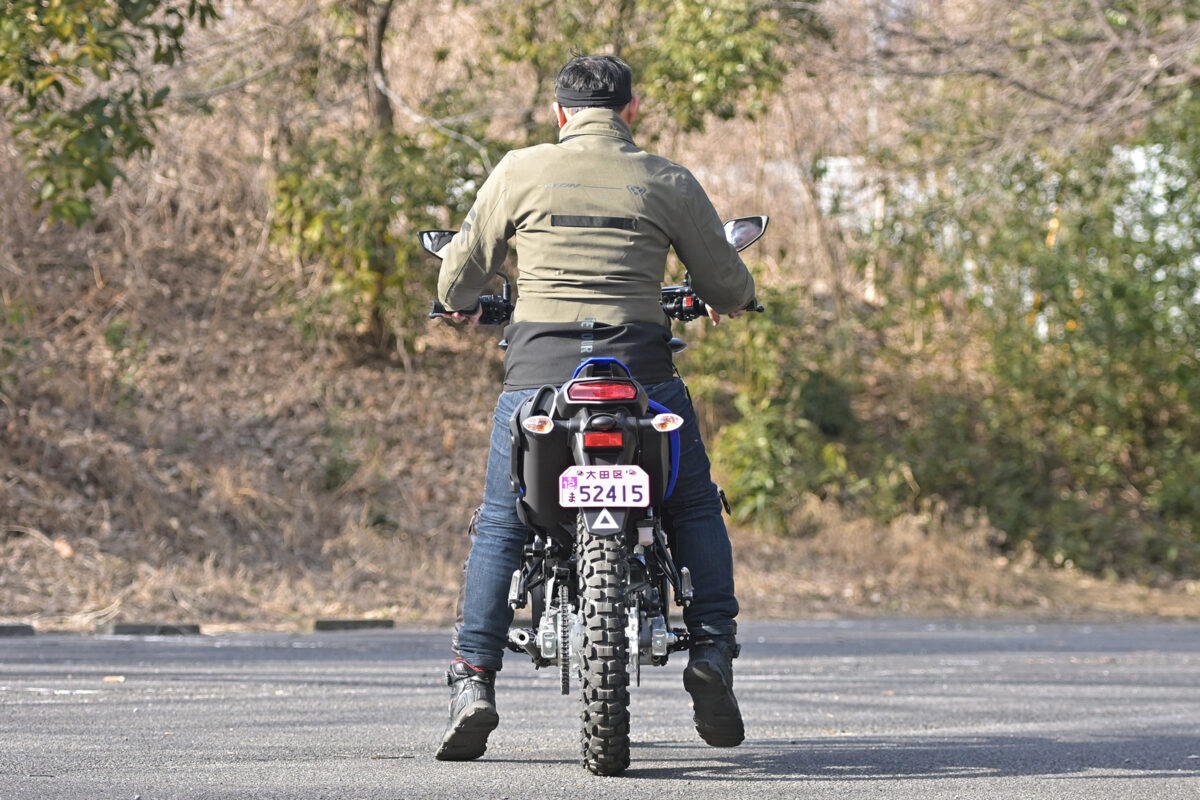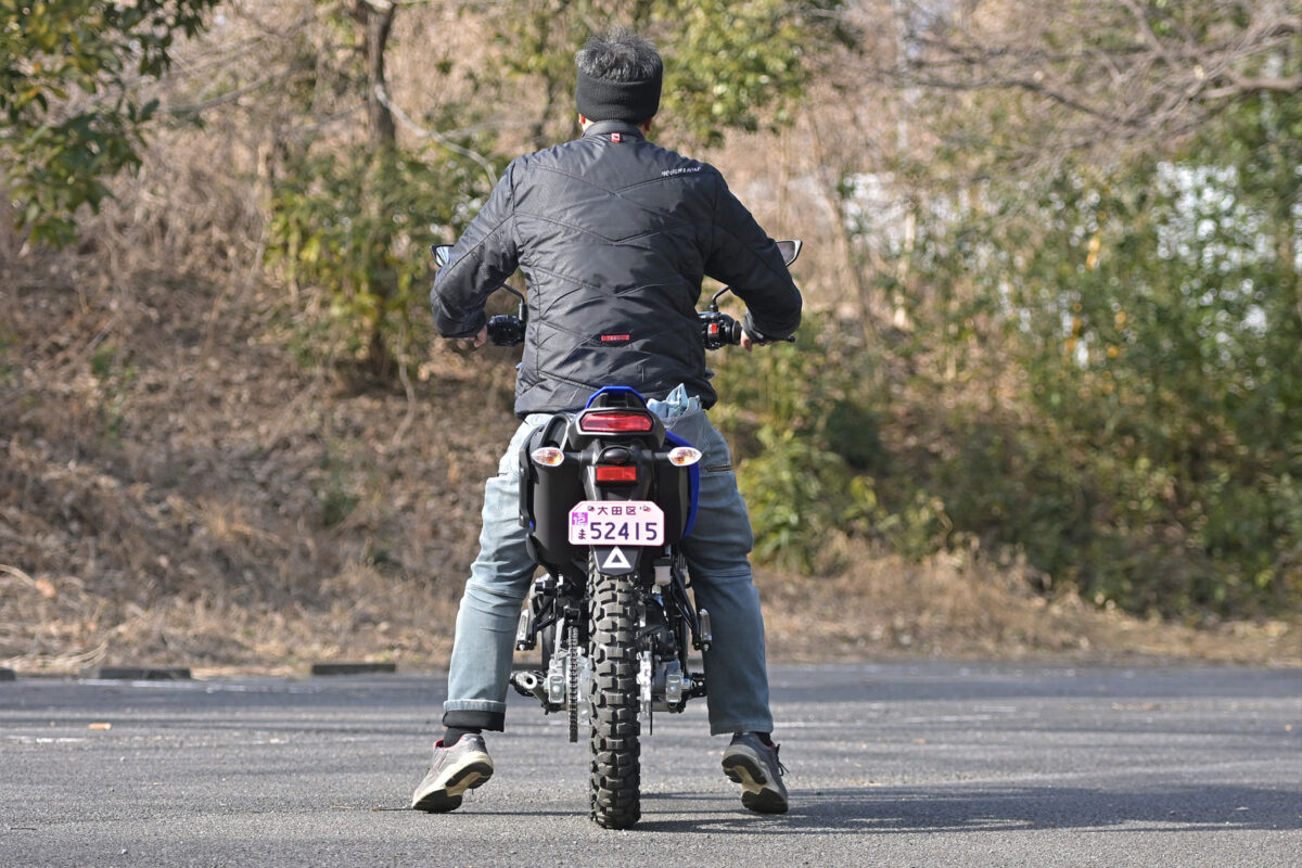 体重が軽くスペンションがほぼ沈まないので、支えるには思い切り腰をずらす必要がある。「でもオフ車としては極端に高いとは感じません。自分の愛車(250ccのオフ車)よりシートがスリムな感じです」