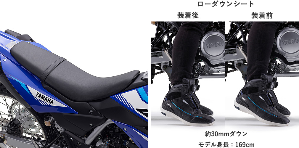 上記の2つを取り付けるとシート高が約70mm下がる。スタンダードが875mmなので、約805mmになる計算だ。ちなみに805mmといえばMT-07と同じ。MT125やXSR125が810mmと聞けば、かなり現実的な数字になるということがわかるだろう。