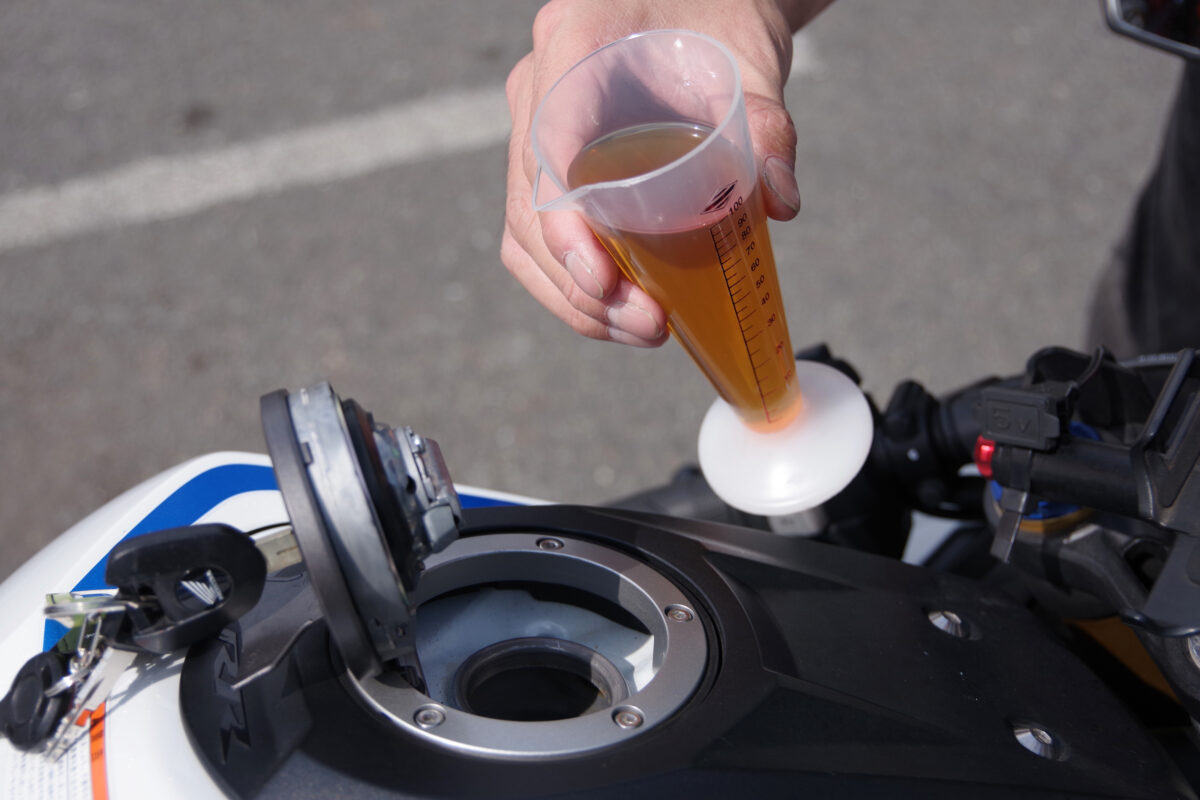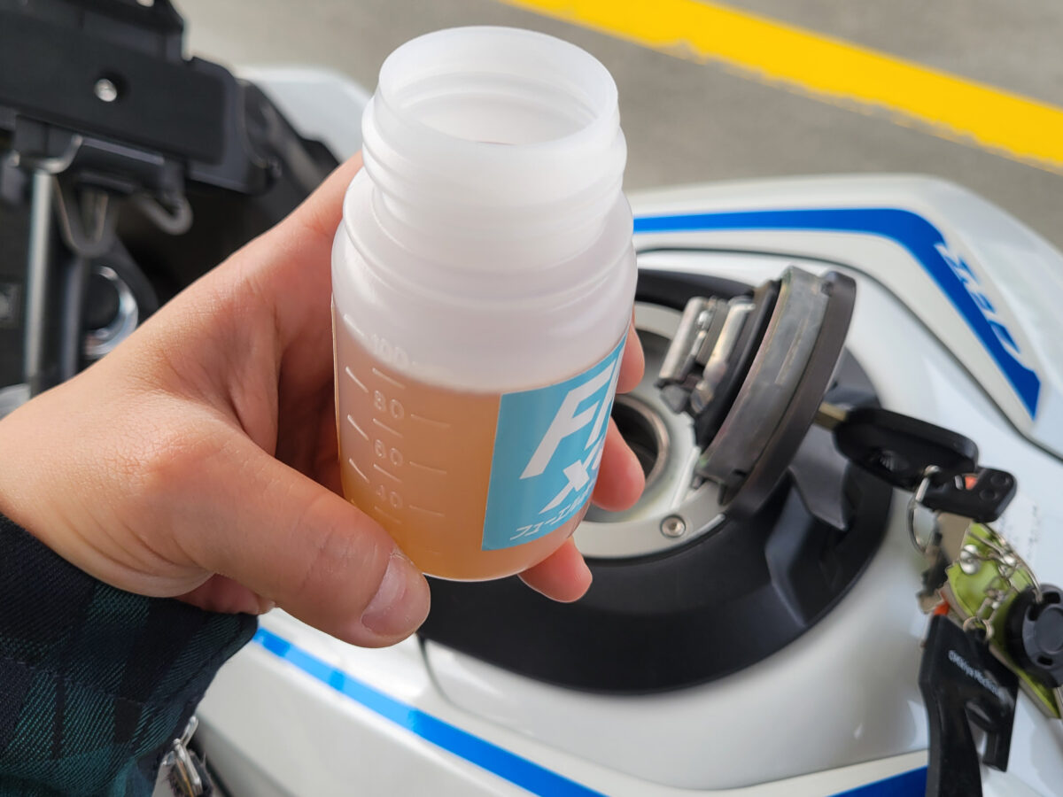 一回の使用量はガソリン量に対して1%が上限とされている。CBR250RRのタンク容量は14Lなので、その1%である140mlを量ってタンクに入れ、同時にガソリンも満たす。