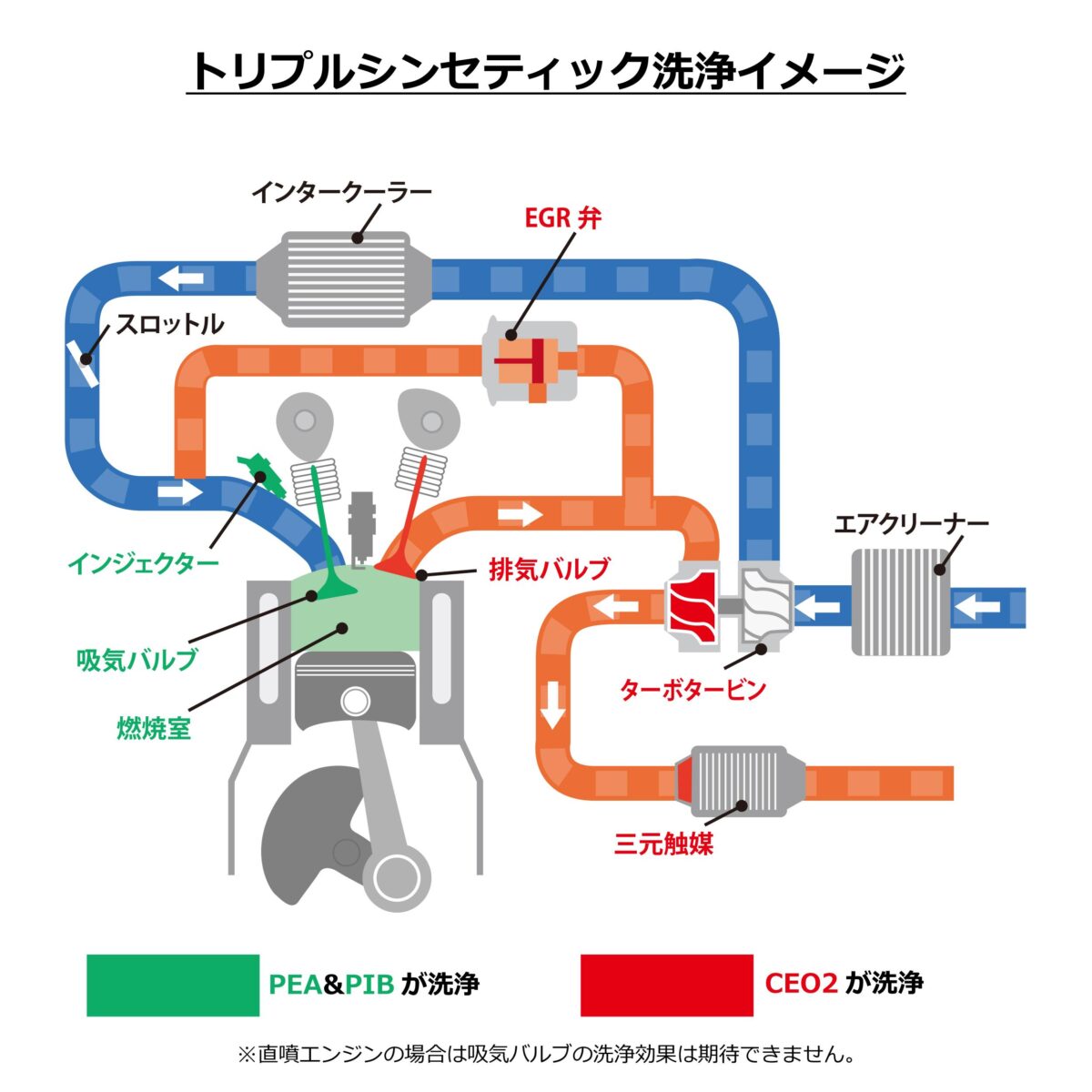 また、これらの効果をフルに出すために高濃度の洗浄成分が3種類配合されており、そのうちの一つ、CEO2(酸化セリウム)という成分がエンジンの燃焼室よりさらにもっと先、マフラーにまで届き、排気周りにも効く、というのが、他のガソリン添加剤にはない大きな特徴となっている。