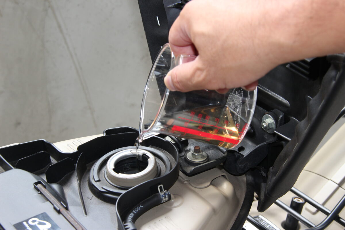 このフューエルポーション3の施工は燃料に対してわずか1%を入れるだけと超簡単だ。本体の容量は300mlなので、タンク容量が30L~50Lの車なら、そのまま1本入れるだけ。逆にバイクの場合は、メスシリンダーや軽量カップに入れて計る必要がある。たった1%入れるだけで効果が出るのだから、つまりは非常に濃度が高く、小排気量のバイクであれば使用量が少ないので非常に経済的である。