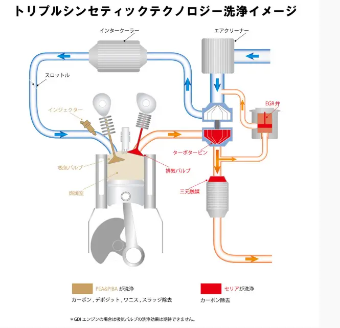 CEO2(酸化セリウム):燃焼後にカーボンを除去するため、従来品では洗浄が困難だったエキゾーストバルブ、触媒、ターボタービン、EGR弁、サイレンサーといった排気系を洗浄するのに有効な成分。酸素貯蔵能力、触媒特性、高温安定性、燃焼効率の向上、環境保護への貢献、化学安定性、燃料安定化など、多岐にわたる特性を備えている。