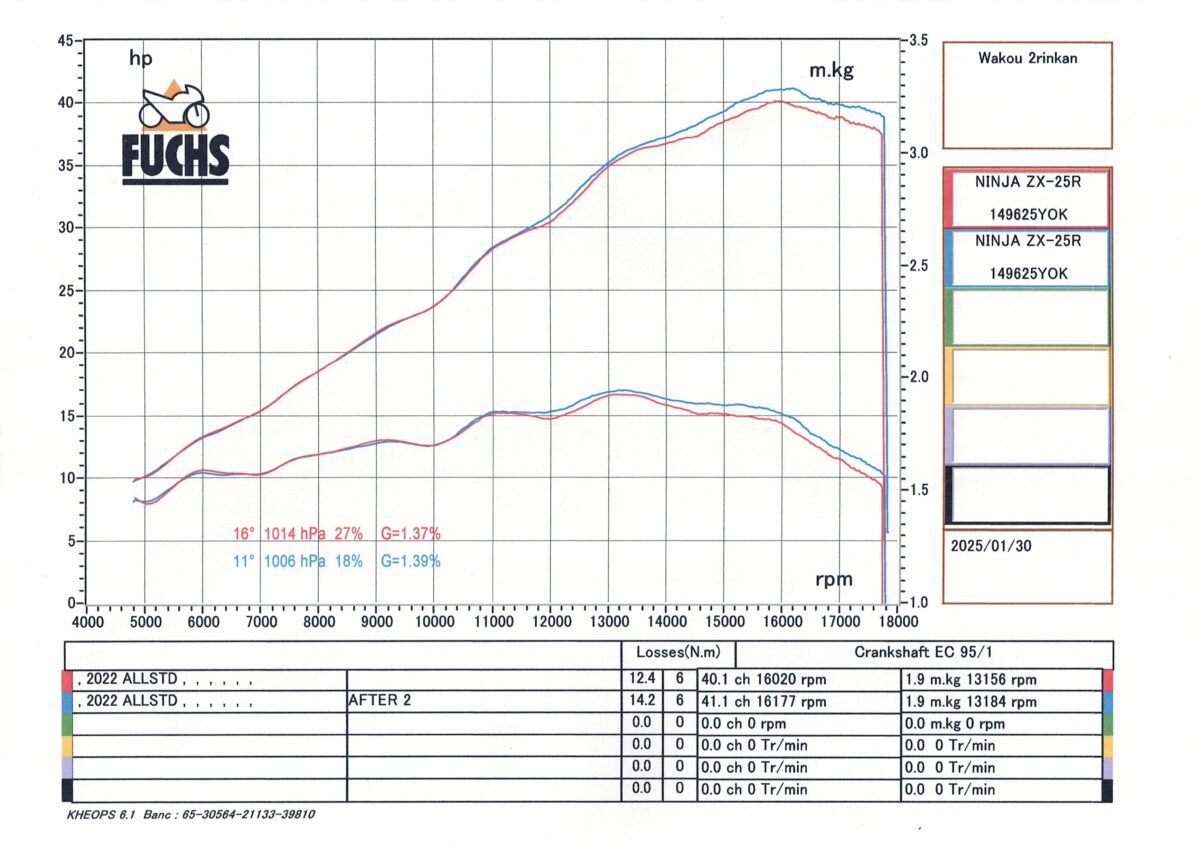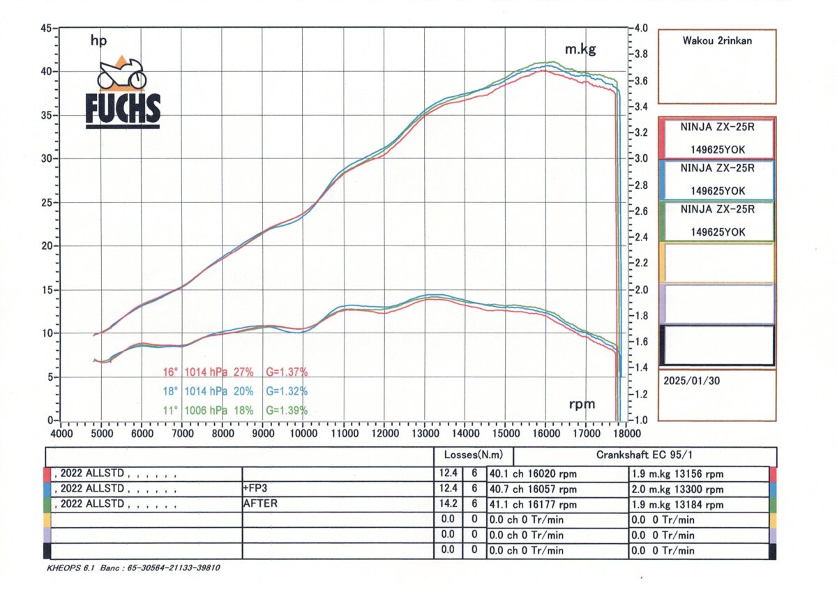 まずはパワーチェックの数値だが、ZX-25Rはきれいに高回転でのパワーアップが測定できた。この結果には、パワーチェックを行ってもらった和光2りんかんのスタッフも驚いていた。新しい車両は比較的、差異が出にくく、各種添加剤やグレードの高いオイル、高価なチェーンを交換後に測っても、エンジンにとっては逆に異物が混入した状態となったり、駆動系には新品パーツのフリクションが増えることとなり、数値が下がってしまうことも多いからだ。