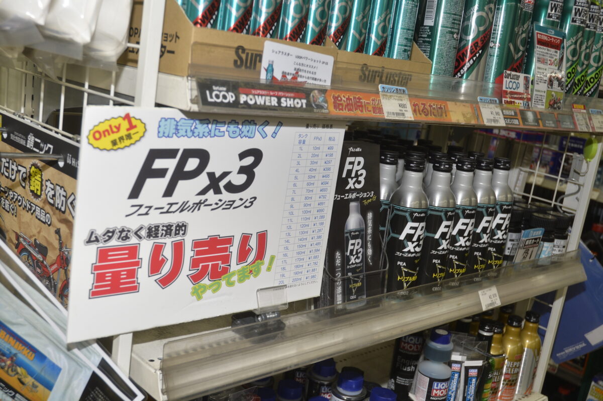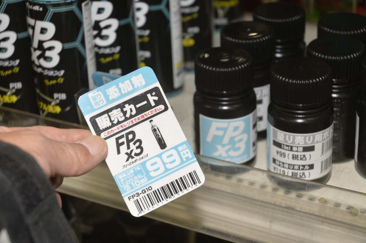 燃料の1%を超えないように注入すると、小排気量車にとって1本分の300mlは多すぎるのが難点だ。しかし、そんなライダーの要望に応え、「2りんかん」ではフューエルポーション3の量り売りを実施している。なんと持帰り用のボトルも販売しているので容器の持参は不要だ。価格は10ml単位(99円~)で購入できるので、まずは試してみたいというライダーにはもってこいの販売形態だ。