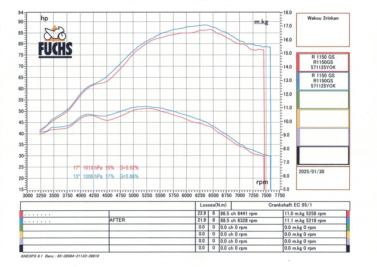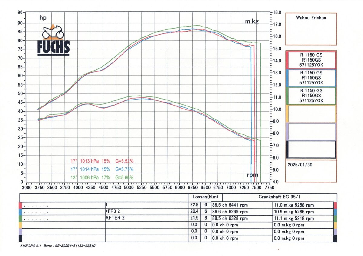そして筆者のR1150GSだが、4500回転付近にあったトルクの谷がなだらかになり、パワーもきれいに上書きされていた。実際にフューエルポーション3を注入し、スロットルのピックアップが明らかに良くなったと体感していたのだが、見事に数値に現れていた。