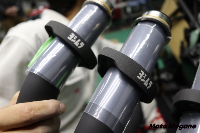 また、取り付けたら見えない部分ではあるがドライカーボンパーツの裏側や、エキパイを取り付けるフランジ部分に〝ヨシムラ〟と入っているのもファンの心をくすぐられる細かいポイントだ。