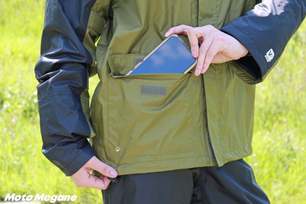 バイク降車時など、使わない時に首ストームガードが邪魔にならない収納固定機能をはじめ、ダブルとなったことで走行風によるバタつきもさらに軽減することができる袖アジャストタブや、くるっと丸めてコンパクトに収納できるようになった収納袋も嬉しいポイント。また、グローブをしたままでも出し入れしやすい大型のポケットに加えて、ベルトからタブになった腹部アジャスト機能や足長やブーツに合わせて微調整が可能になった裾まで、細部に至るアップデートはまさに正当進化という印象です!