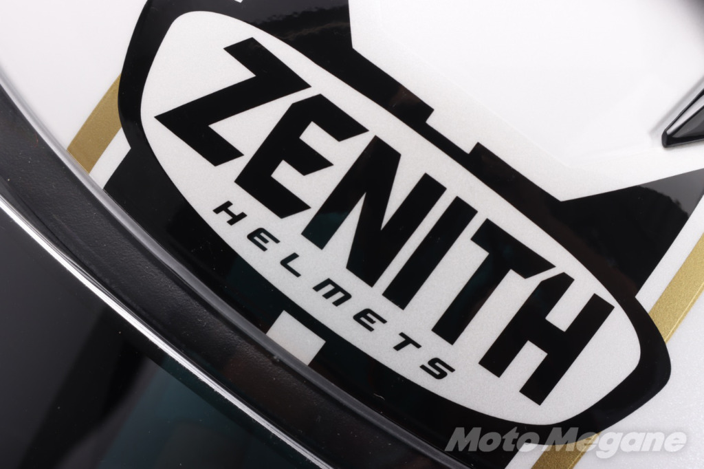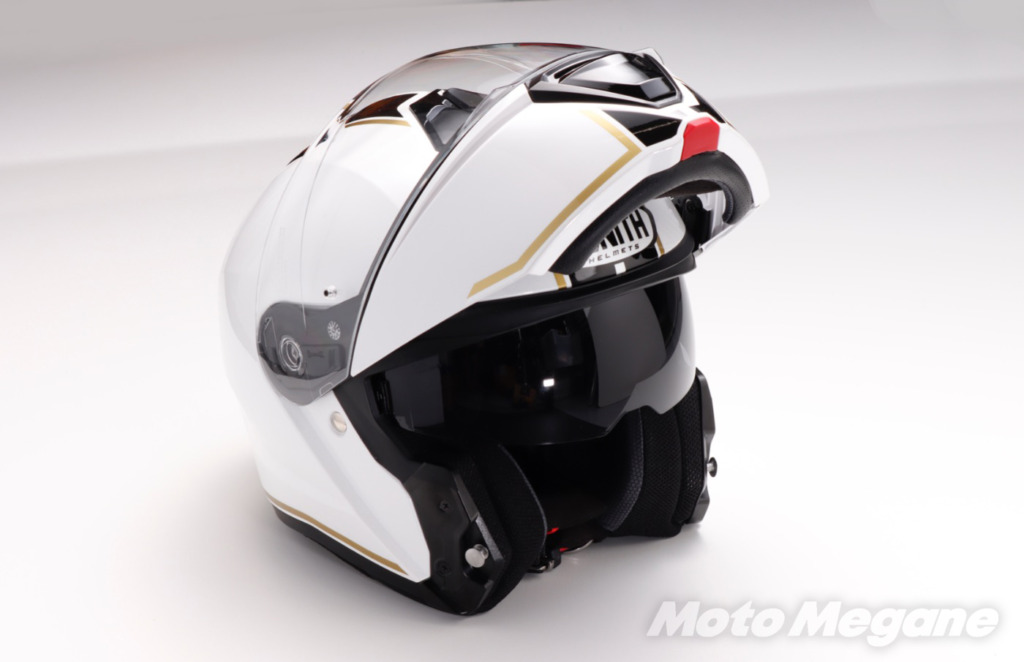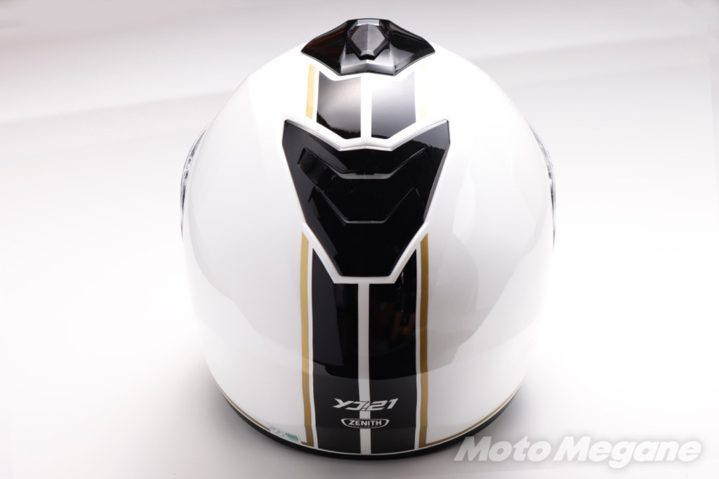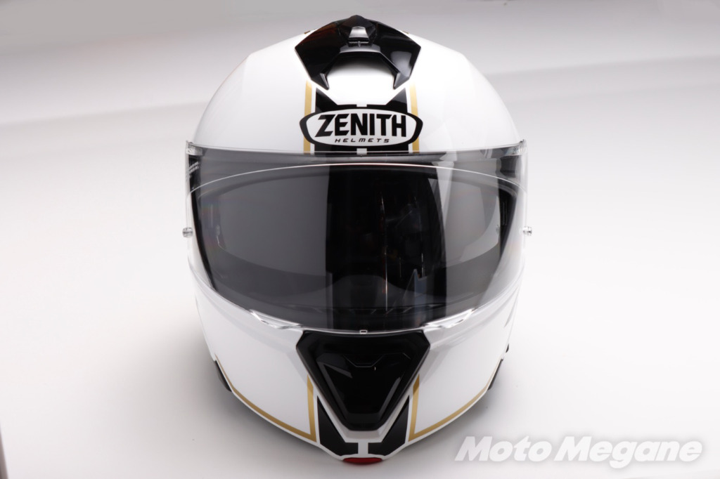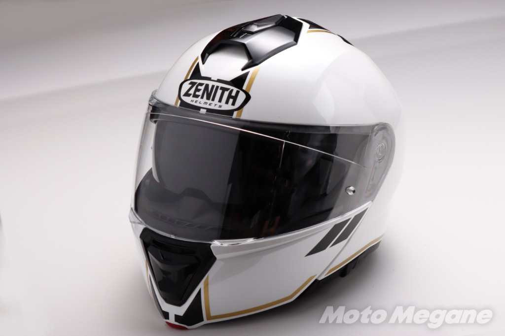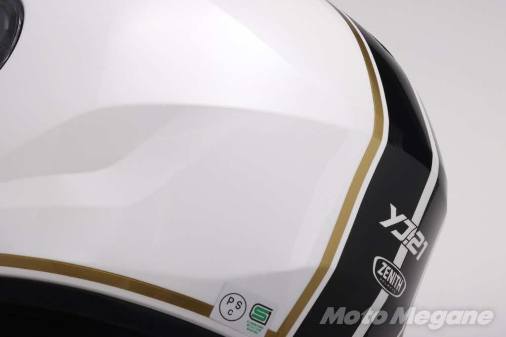 ここで紹介するシステムヘルメット、ゼニスのYJ-21はグラフィックモデルで、パールホワイトにゴールドとブラックのラインが入るデザイン。