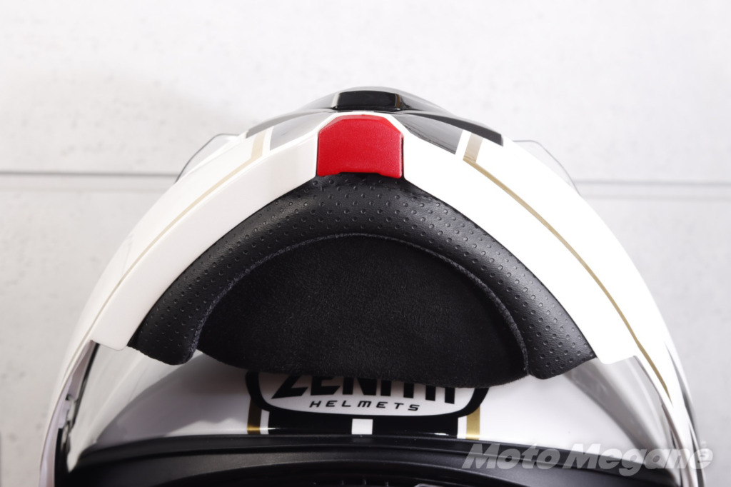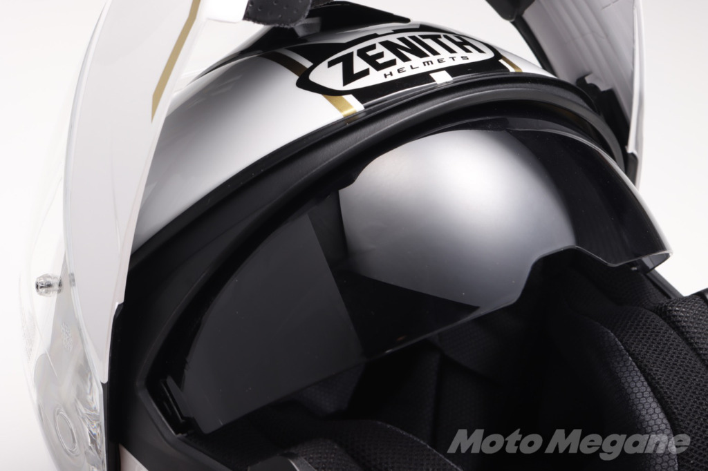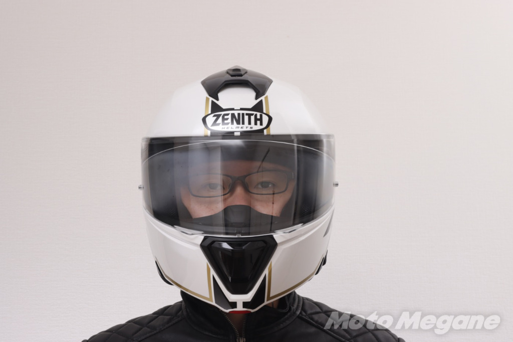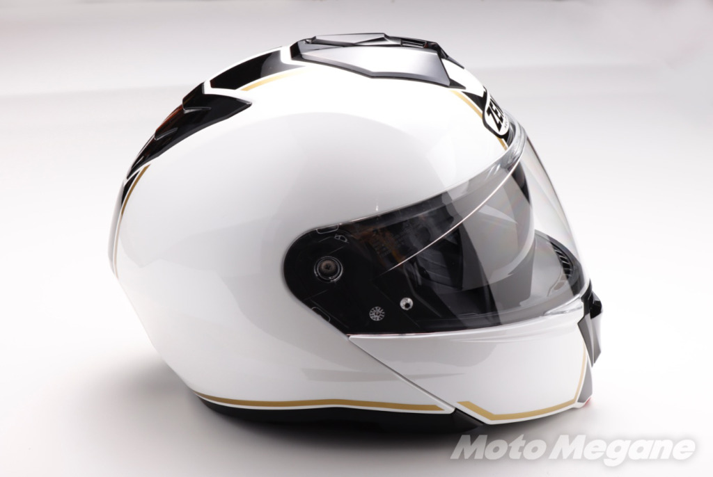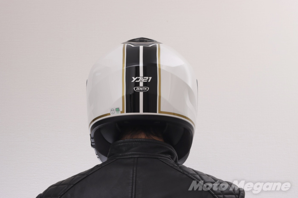 ここで紹介するシステムヘルメット、ゼニスのYJ-21はグラフィックモデルで、パールホワイトにゴールドとブラックのラインが入るデザイン。