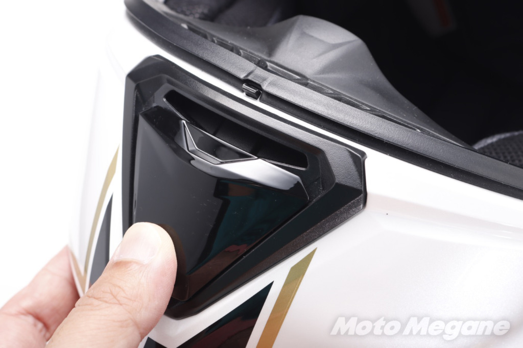 グローブをした手でもしっかりつまめる大きめの突起がシールド左右に設けられている。