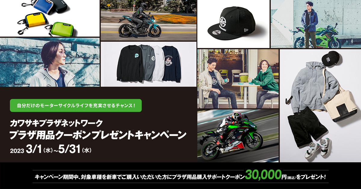 株式会社カワサキモータースジャパン(本社:兵庫県明石市、代表取締役社長:桐野 英子)が展開するカワサキプラザネットワークでは、2023年5月31日までに250㏄クラスの新車(2022年モデル以前)をご購入いただいたお客様へ”カワサキプラザアパレルグッズ”購入時に使用できる「プラザ用品購入サポートクーポン 30,000円分(税込)」をプレゼントする「プラザ用品クーポンプレゼントキャンペーン」を実施いたします。