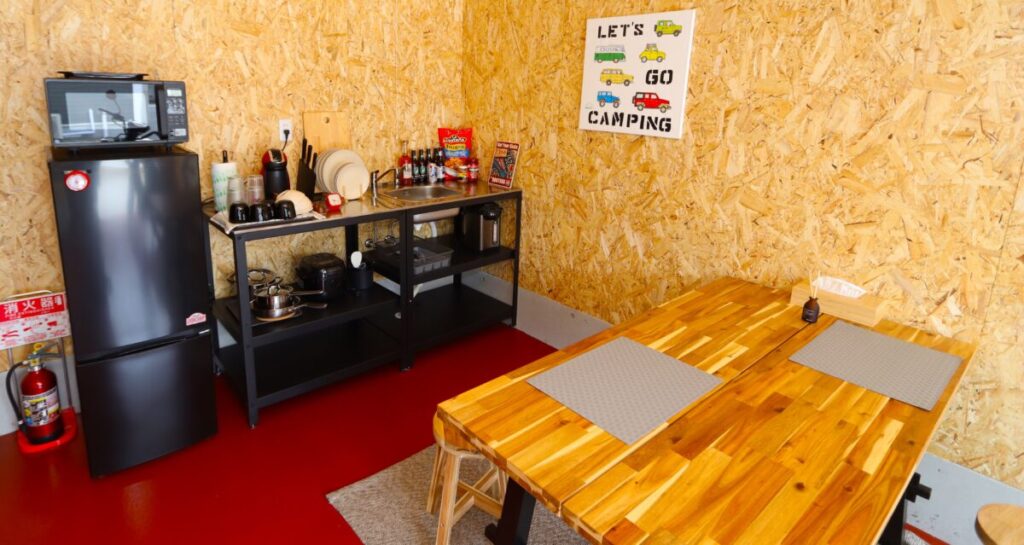設備内容:ガレージ(バイク乗入可能)、リビングスペース、ロフト2カ所(寝具付)、ガレージ内にキッチン、テーブル、椅子4脚、エアコン、換気扇、冷蔵庫、電子レンジ、電気式バーベキューグリル、IHクッキング、ポット、調理器具、食器類、リビングエリア内に、ソファーベッド(寝具付)、シャワー、トイレ、エアコン、空気清浄機、モニター