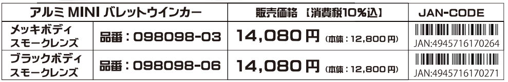 バイクのカスタムパーツの企画・製造・販売を行うポッシュフェイス株式会社は、スリムな砲弾タイプのアルミMINIバレットLEDウインカーを発売した。小型でスリムな砲弾タイプは、様々な車両全体のフォルムを引き立ててくれるアイテムだ。スモークレンズ仕様、ボディはメッキとブラックの2種をラインナップ。価格は14,080円である。