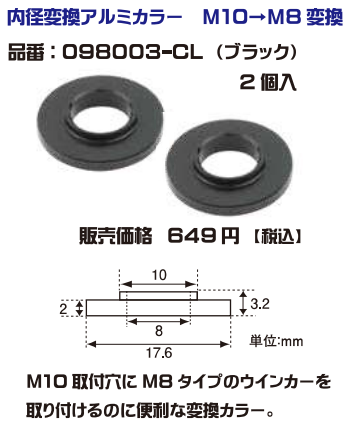 別売りのM10→M8穴変換カラー(品番:098003-CL)との併用をお勧めします。