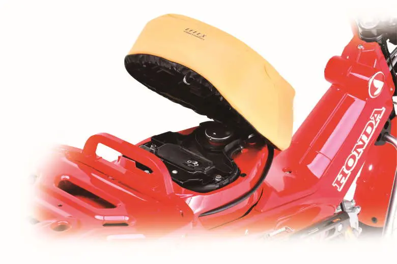 CT125。ハンターカブは給油の際、給油口がシート下にあるため、シートを開くのにシート下のキーシリンダーにキーを挿して、キーを回しながらシートを持ち上げるという両手での作業が毎回必要だ。