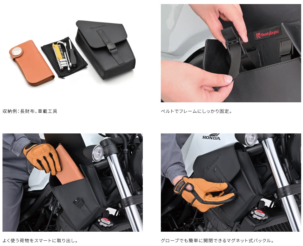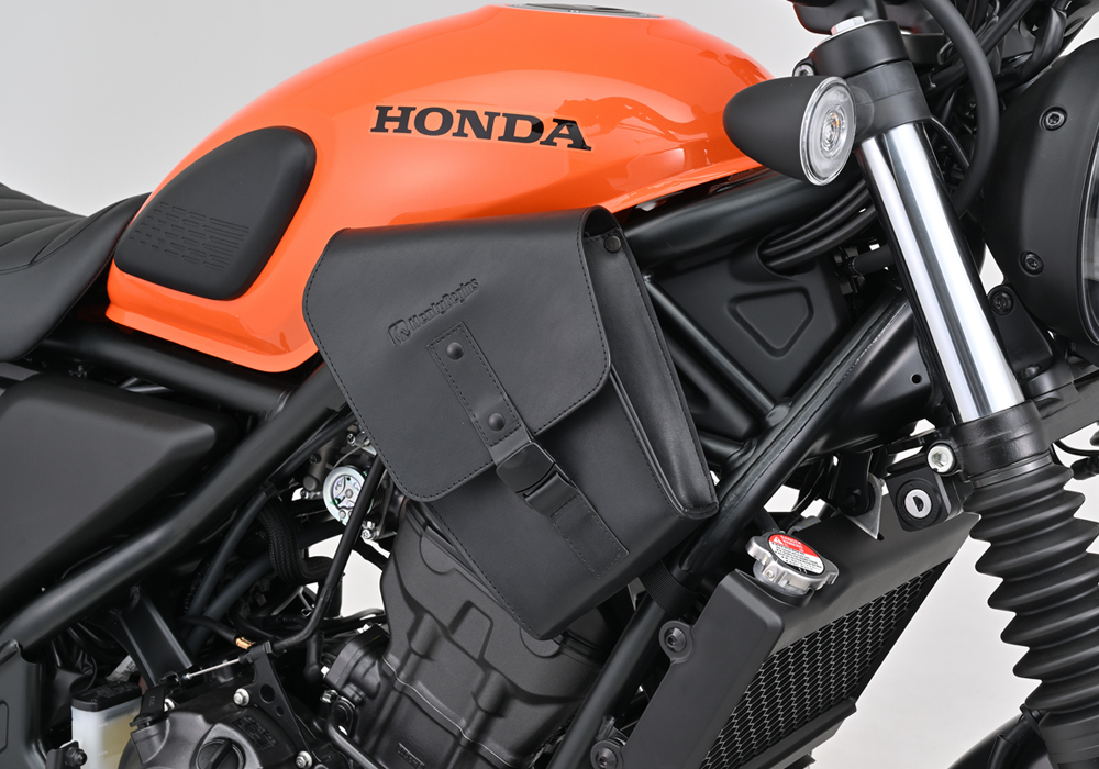 CL250/Rebel250のフレームに取り付けできるバッグ。フレームにベルトで固定するだけなので取り付けが簡単。フレーム形状に合わせたデザインは車体のイメージを崩しません。レザー調なのでドレスアップにも一役買います。