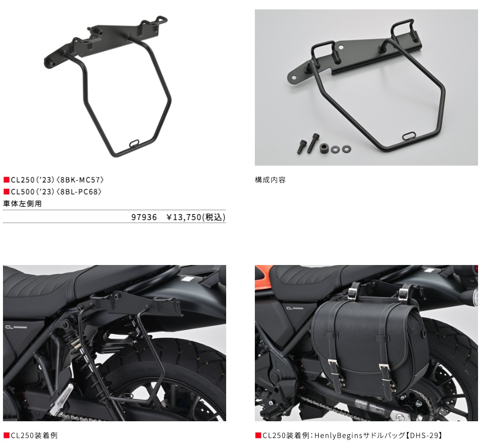 株式会社デイトナは、Rebel250/CL500用フレームバッグとCL250/500用サドルバッグサポート(ベルトループ一体型) を発売した。フレームにベルトで固定するだけの簡単に取付が可能なフレームバッグは、フレーム形状に合わせたデザインのため車体のイメージを崩さず、ドレスアップにも最適なアイテムである。価格は11,550円。サドルバッグサポートは、ベルトループ一体型でサドルバッグハンガーが不要。ループはバッグ装着のほか、ユーティリティーネットを掛けるのにも便利だ。リアサス、リアアクスルにサドルバッグが接触しにくい形状となっているのも嬉しい。価格は13,750円(いずれも税込)。