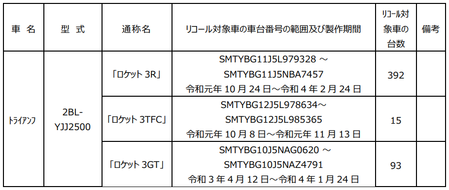 トライアンフモーターサイクルズジャパン株式会社は、セーフティーリコールとして国土交通省へリコール届出を行ったことを発表した。