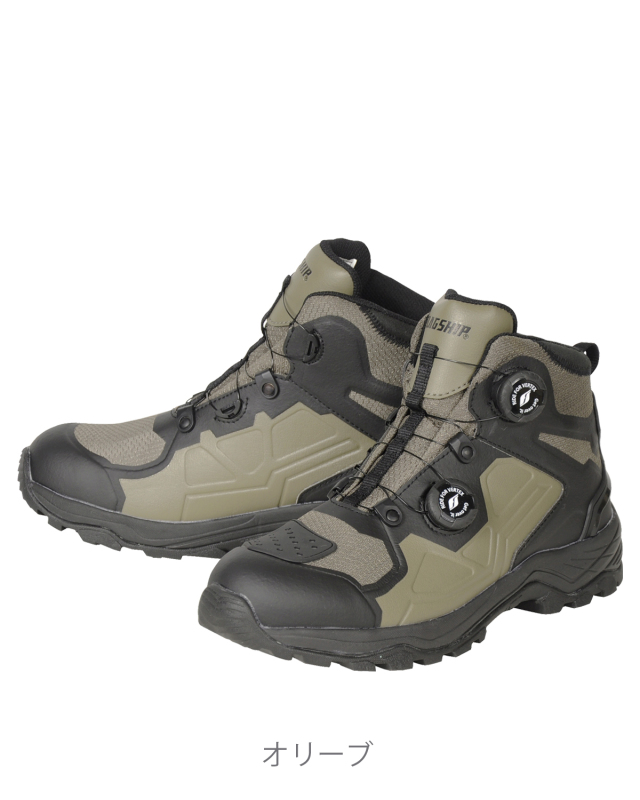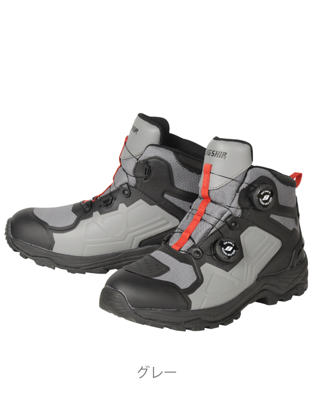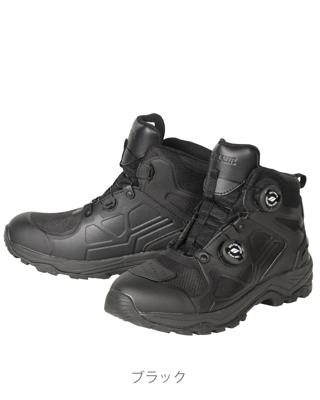 アンクルカットとフラットソールの組み合わせにより歩行性と操作性を両立し、夜間走行時の視認性を確保するため反射素材のパイピングも施されている。インソールはパンチング仕様で通気性に優れ、日本人に多い甲高幅広の足型に適合する2E相当の設計となっている。