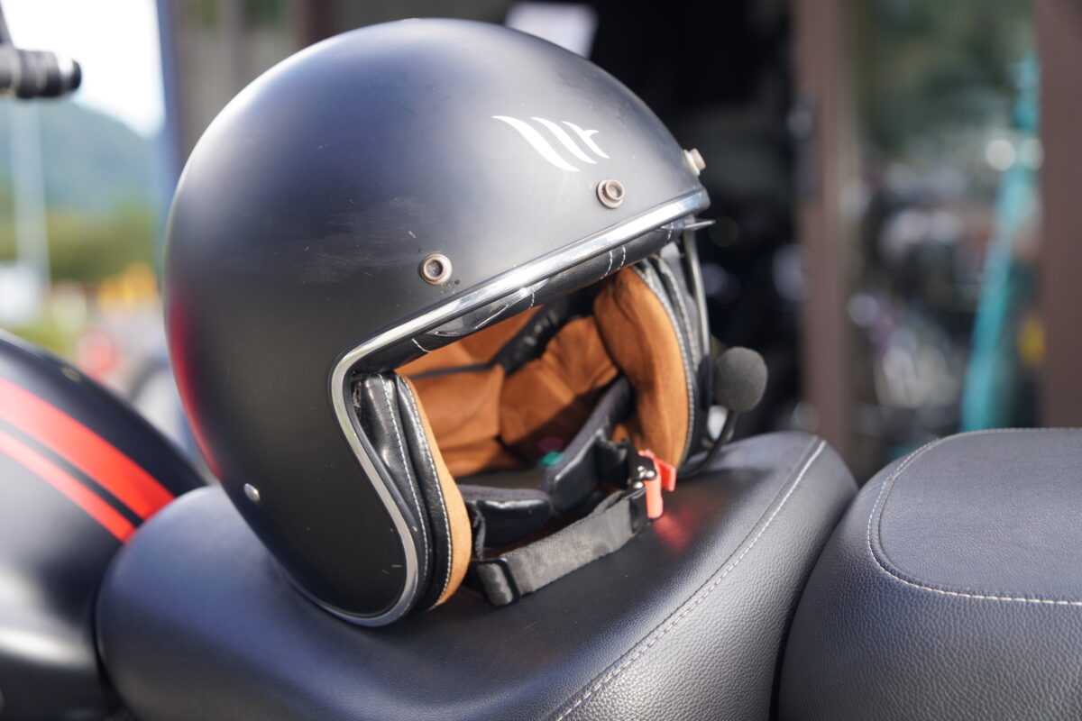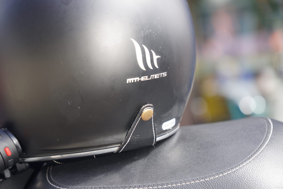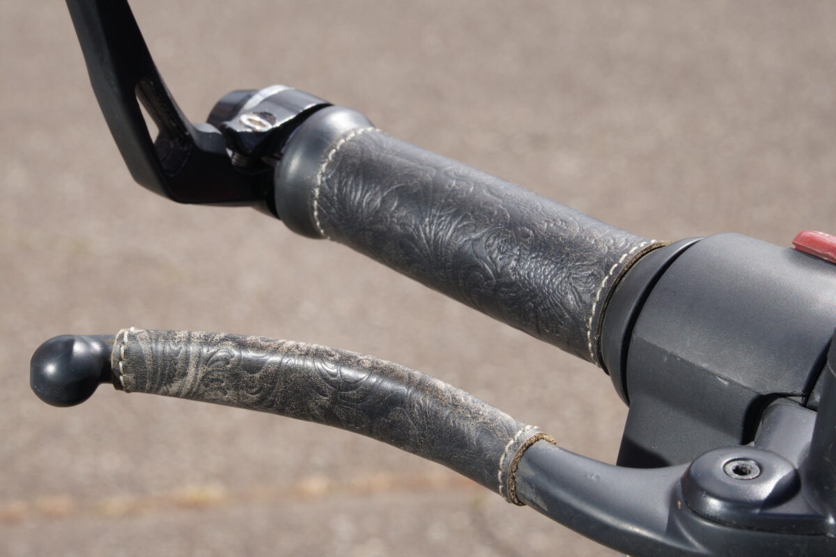 レバー&グリップにレザーカバーを付けてドレスアップしています。カバーのおかげでグリップが太くなり、長距離を走るときにラクになりました。ヘルメットはスペインのメーカー品です。