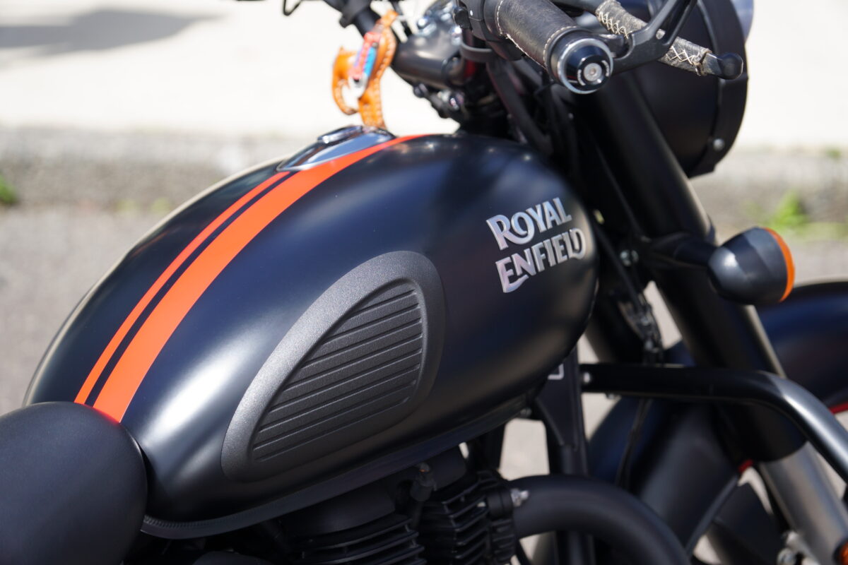 フォルムが丸くてメカっぽい雰囲気ですね。タンク横にRE(=Royal Enfield)から始まる個体ごとに違う番号が付いているところも気に入っています。国産車にはない遊び心ですよね。