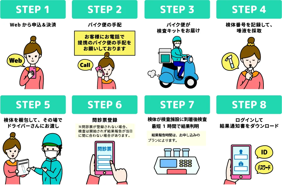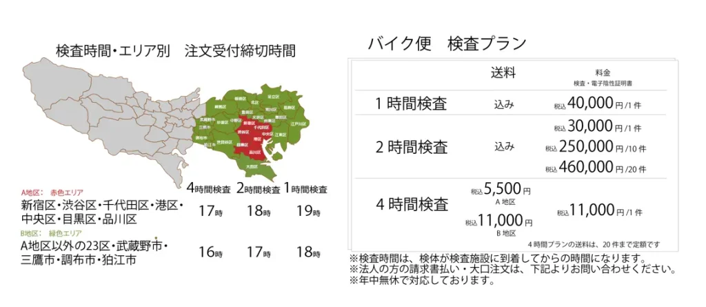 注文後、約1時間で東京23区と東京都下の一部の地域に、バイク便の配達員が検査キットをお届けし、その場で検体を回収、検体を検査施設まで配達し、検体が検査施設に到着後、規定の時間内に検査結果を通知し、電子陰性証明書を発行するプランをリリースいたします。