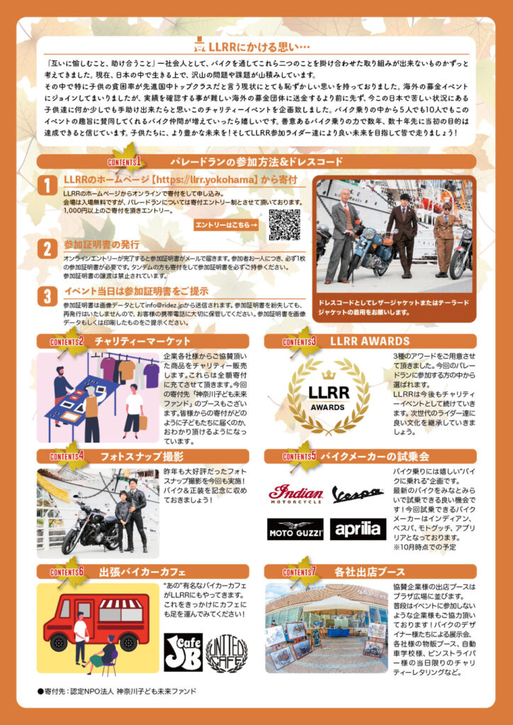 内容:チャリティーパレードラン、チャリティーマーケット、LLRRアワード、フォトスナップ撮影、試乗会、出張バイカーカフェ、各社様出店ブース