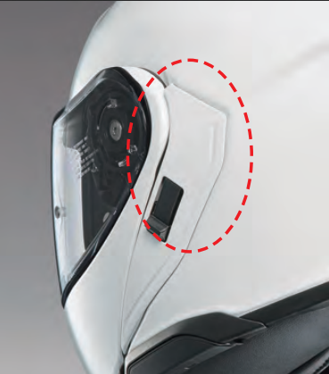 フェイスカバー全開時のロック機構は NEOTEC II より継承し、2段階でフェイスカバーを固定します。1段階目はヘルメット着脱時等に適し、2 段階目はヘルメットを被ったまま作業等を行ってもフェイスカバーが閉じない強い保持力を発揮。パーツを追加することなくフェイスカバーベースの構造によって実現しているため、パーツの増加による重量増を防ぎつつ機能性を高めたロック機構です。