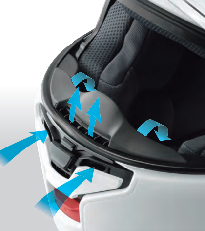 アッパーエアインテークはシェルデザインにマッチしたシンプルかつ、厚手のグローブでも操作しやすいデザインです。トップエアアウトレットは自社大型風洞実験設備での検証により導き出した排気効率の高い形状を採用し、高効率なベンチレーションシステムを実現。