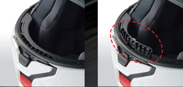 チークパッドの後端をヘルメット後方へ延長し、首周りの隙間をより広範囲でカバー。ヘルメット下端部からの風の侵入を防ぎます。