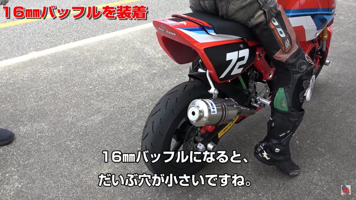 翌年もレースを開催するためにはどうすればいいのか。サーキットの方々と協議したところ、「翌年も開催するのであれば、音量規制が必要」という話になりました。具体的には単気筒125ccの HRC グロムにバッフルを装着して対応することになりました。さまざまなバッフルを装着して試験走行した結果、16mmのマフラーバッフルを装着することで音量がクリアできることが見込まれました。
