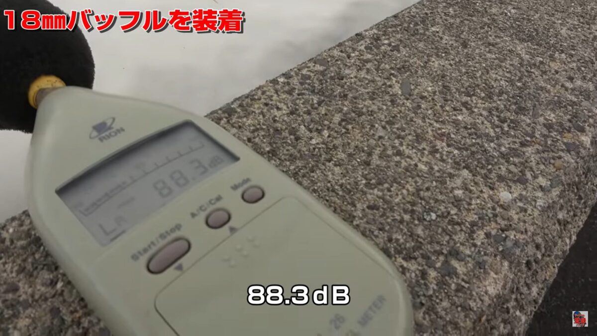 次に16mmのバッフルを装着した時に、どれくらいの性能低下があるかもテストしました。何もつけない状態と、さらに小さい14mmのバッフルをつけた状態でのタイム差は0.4秒程度です。16mmになると少し馬力が出るので、タイム差は0.3 秒ぐらい。その差はそれほど大きくないと思います。これによって16mmのバッフル装着が採用されました。