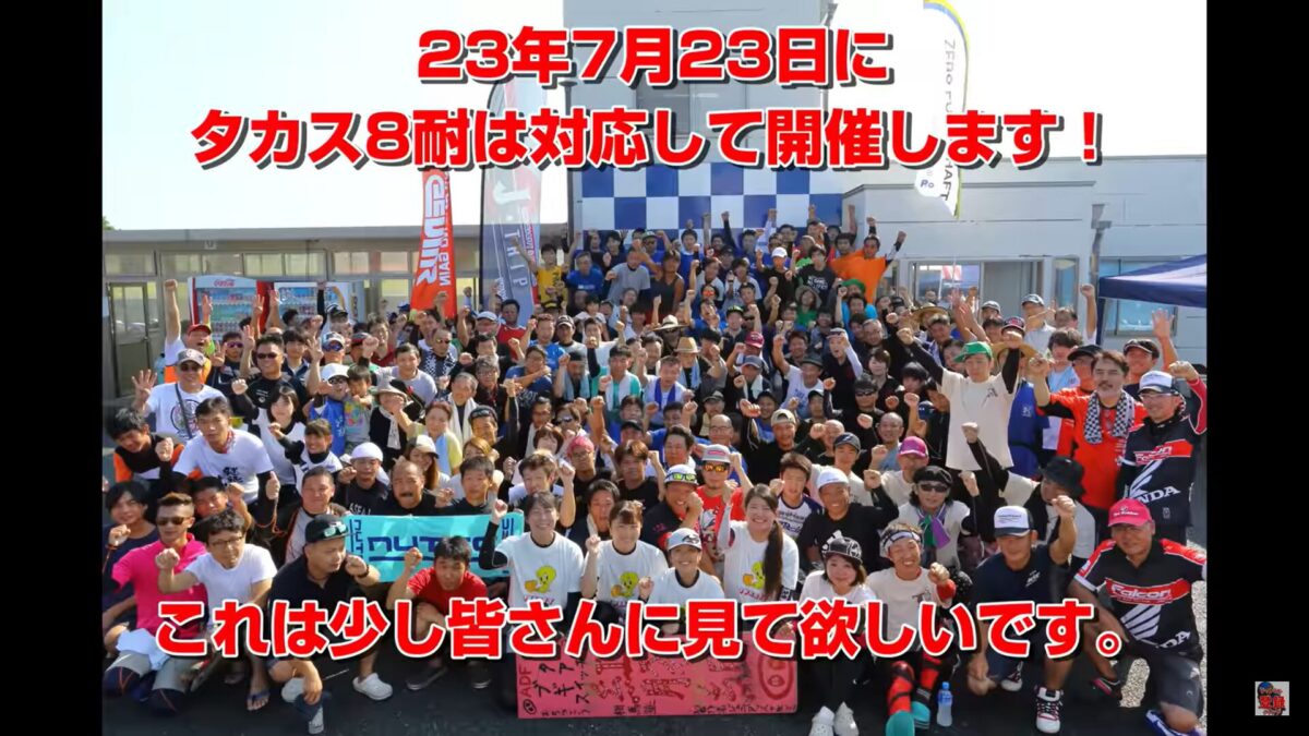 たくさんの人たちの協力を得て、23年7月23日にタカス8耐が開始できました。動画には音量を抑えるためのバッフルテストの様子が収められています。それは私たちにとって「過去の話」ですが、実は全国のサーキットでも発生しうる「未来の話」でもあります。しんたろう炎の動画「タカス8耐開催目指して!音量を下げよ!炎のマフラーテスト!」が、住民とのトラブルを回避するための参考になると嬉しいです。