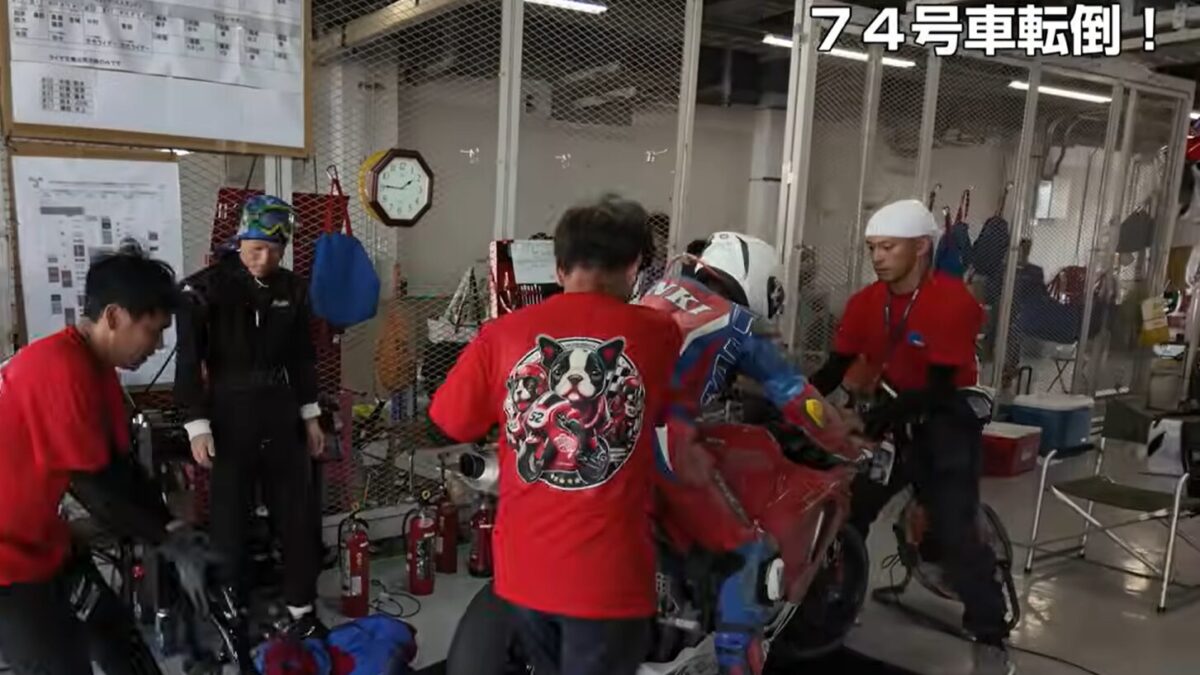本番当日はものすごく暑く、ライダーもスタッフも気が抜けない状況です。ジョンさんのペアライダーのジュンキさんが2回目の逆バンクで転倒。マシンは外装一式がダメになり、いろいろと交換が必要になりました。