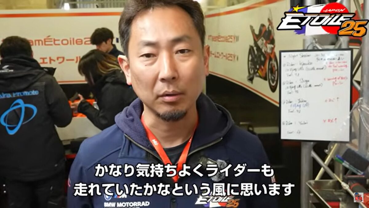 午前中のフリープラクティスは、ドライコンディションでしたので、ライダーは気持ち良く走れたと思います。榎戸選手はまだBMWのマシンに慣れていないようですが、24時間耐久レースの中での走り込んで慣れることで解決するでしょう。明日の第2予選は、雨が降るかもしれません。レース直前なので転倒しないことを祈ります。