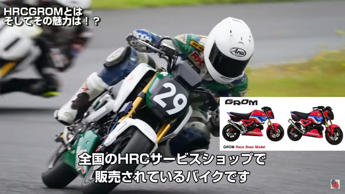 HRC GROMは、排気量125ccのホンダGROMをベースにしたレース専用バイクで、全国のHRCサービスショップで販売されています。ベースは税込みで50万円弱。ポジションを調整するぐらいですぐ勝負できます。ミッションは4速のGROMと5速のGROMがありますが、4速でも勝負できます。
