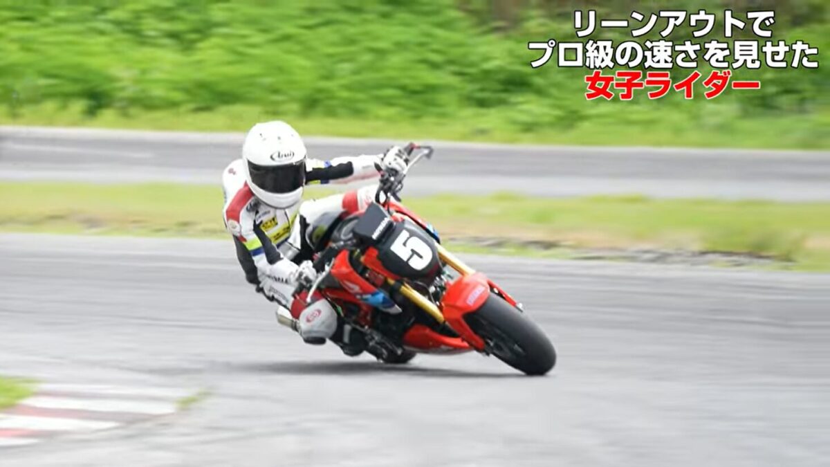おおわら4時間耐久に参戦した「ちなつちゃん」という最速女子の走りです。全体的に体に力が入っていません。曲がるのがうまく、高い速度を維持してコーナーを立ち上がります。リラックスしたフォームが印象的です。