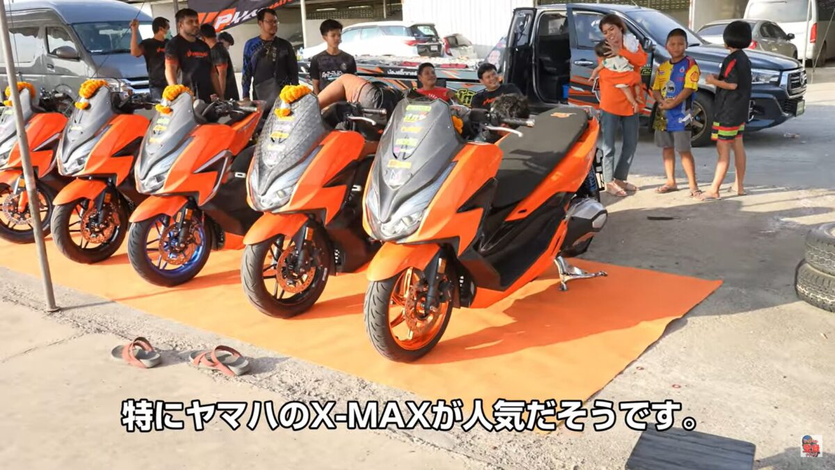 バンコク西部のスクーターのイベントです。参加マシンのほとんどがヤマハ・X-MAXなので、そのためのイベントなのかと思いました。タイではギア付きのバイクよりスクーターがストリートのメインだそうで、ダントツでX-MAXが人気です。日本では排気量250ccですが、タイでは300ccを誇り、ビッグバイクとして扱われています。