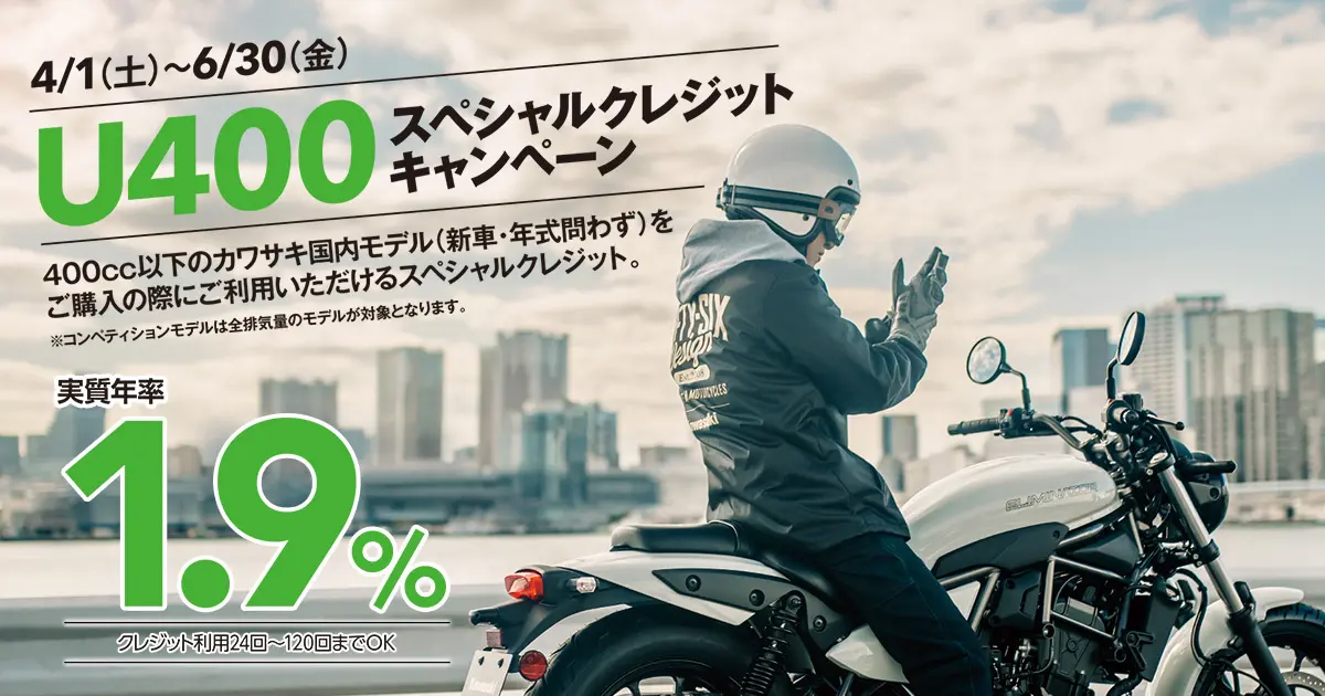 株式会社カワサキモータースジャパン(本社:兵庫県明石市、代表取締役社長:桐野 英子)は、4月1日(土)より400㏄以下のカワサキモーターサイクル(コンペティションモデルを含む新車)を、カワサキ正規取扱店で購入時に実質年利1.9%でご利用いただける「U400 スペシャルクレジットキャンペーン」を開始いたします。