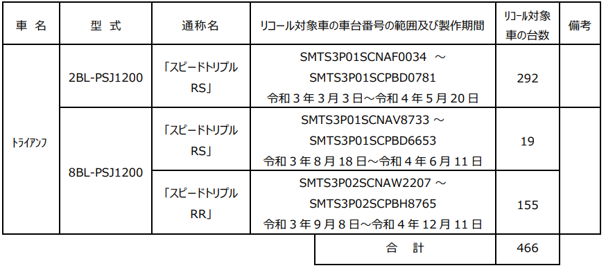 トライアンフ モーターサイクルズ ジャパン株式会社は、国土交通省へSpeed Triple RS/RRのリコール届出を行った。対象車は466台であり、使用者へはダイレクトメールにて通知される。