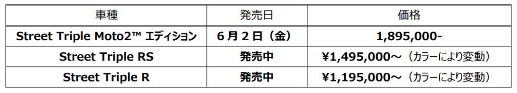 トライアンフモーターサイクルズジャパン株式会社(本社:東京都港区海岸 代表取締役社長:大貫陽介)は、ストリートファイターの決定版として生まれ変わった、新型 Street Triple 765 の最上位限定生産モデルである「StreetTriple 765 Moto2™ エディション」が、6 月 2 日(金)より順次、全国のトライアンフ正規販売店へデリバリーされることをお伝えいたします。