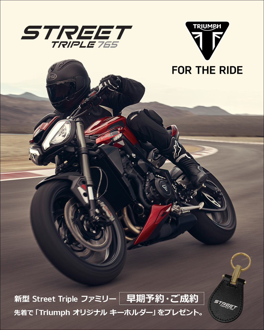 トライアンフモーターサイクルズジャパン株式会社は、新型 Street Triple Familyの早期予約キャンペーンを開催すると発表した。キャンペーンの特典として、2023年2月20 日までの期間中、新型 Street Triple ファミリーの車輌を早期予約したユーザーに対し、トライアンフのオリジナルキーホルダーを納車時に配布する。ぜひこの機会に、Street Triple 史上最もパワフルな車輌と、同キャンペーンでしか手にはいらないグッズをゲットしよう。
