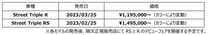 トライアンフモーターサイクルズジャパン株式会社は、Street Triple RとStreet Triple RSの発売日を発表した。パワー、トルク、パフォーマンスの向上と、トライアンフならではの細部へのこだわりにより、ストリートファイターの決定版となったSTREET TRIPLE 765 Rは、2023年3月25日発売。エンジンのアップグレードにより、クラストップの 130PS というスリリングなパワーとなったSTREET TRIPLE 765 RSは、2023年2月25日発売だ。