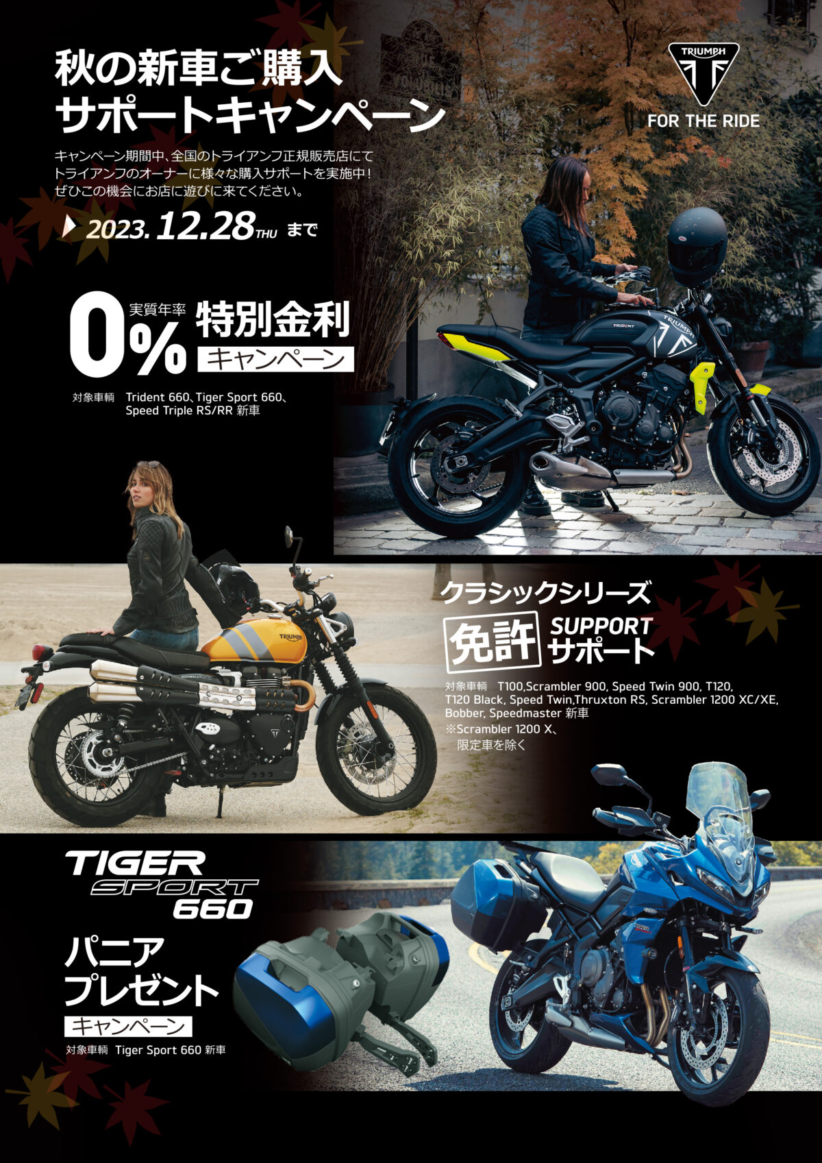 トライアンフモーターサイクルズジャパン株式会社(本社:東京都港区海岸 代表取締役社長:大貫陽介)は現在、10 月1日~12 月 28 日までの期間中、「秋の新車ご購入サポートキャンペーン」を全国のトライアンフ正規販売店において開催し、新車ご購入のお客様を後押しするキャンペーンを開催することをお伝えします。